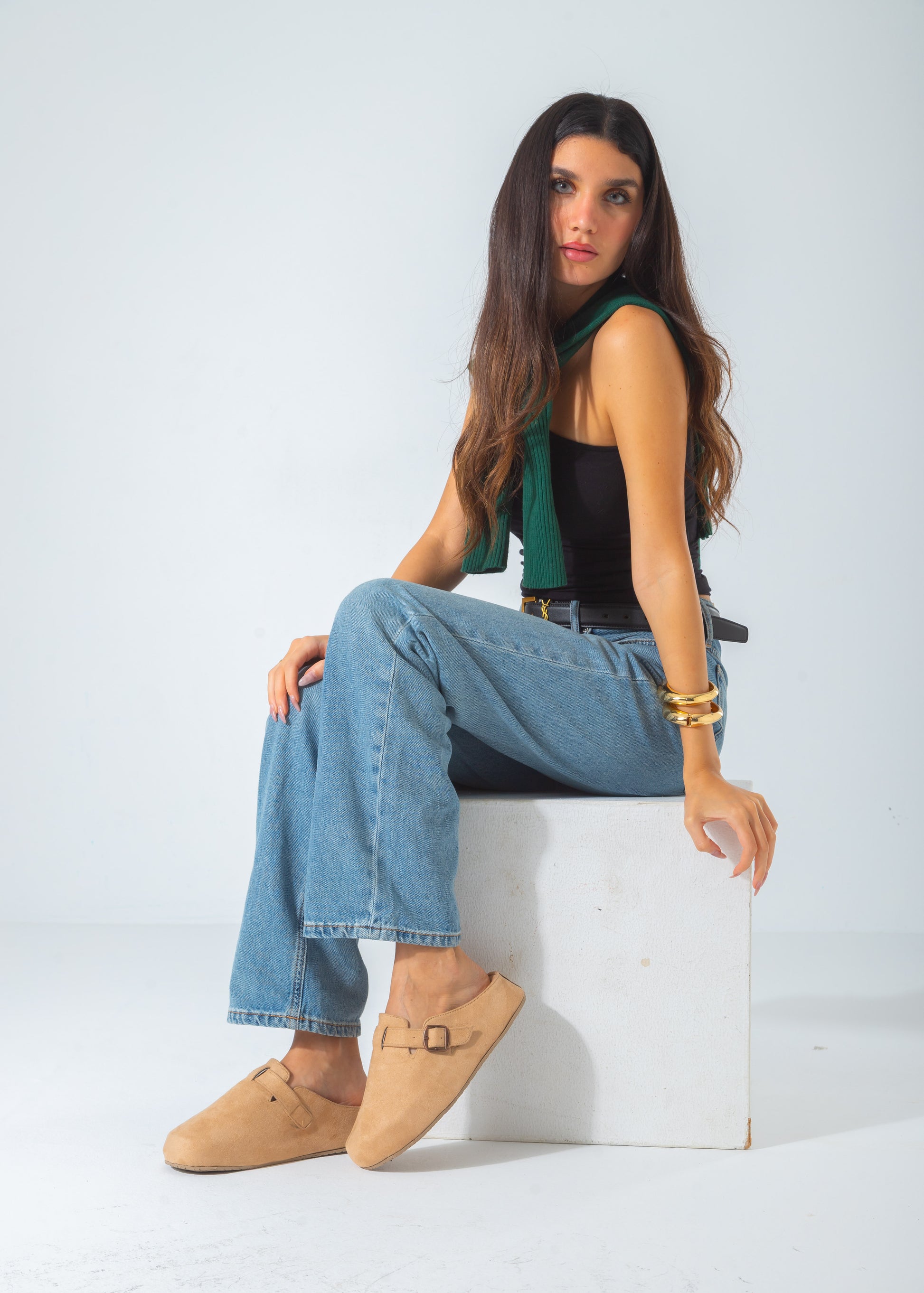 Suede Buckle Slip-On Mule Clogs-beige