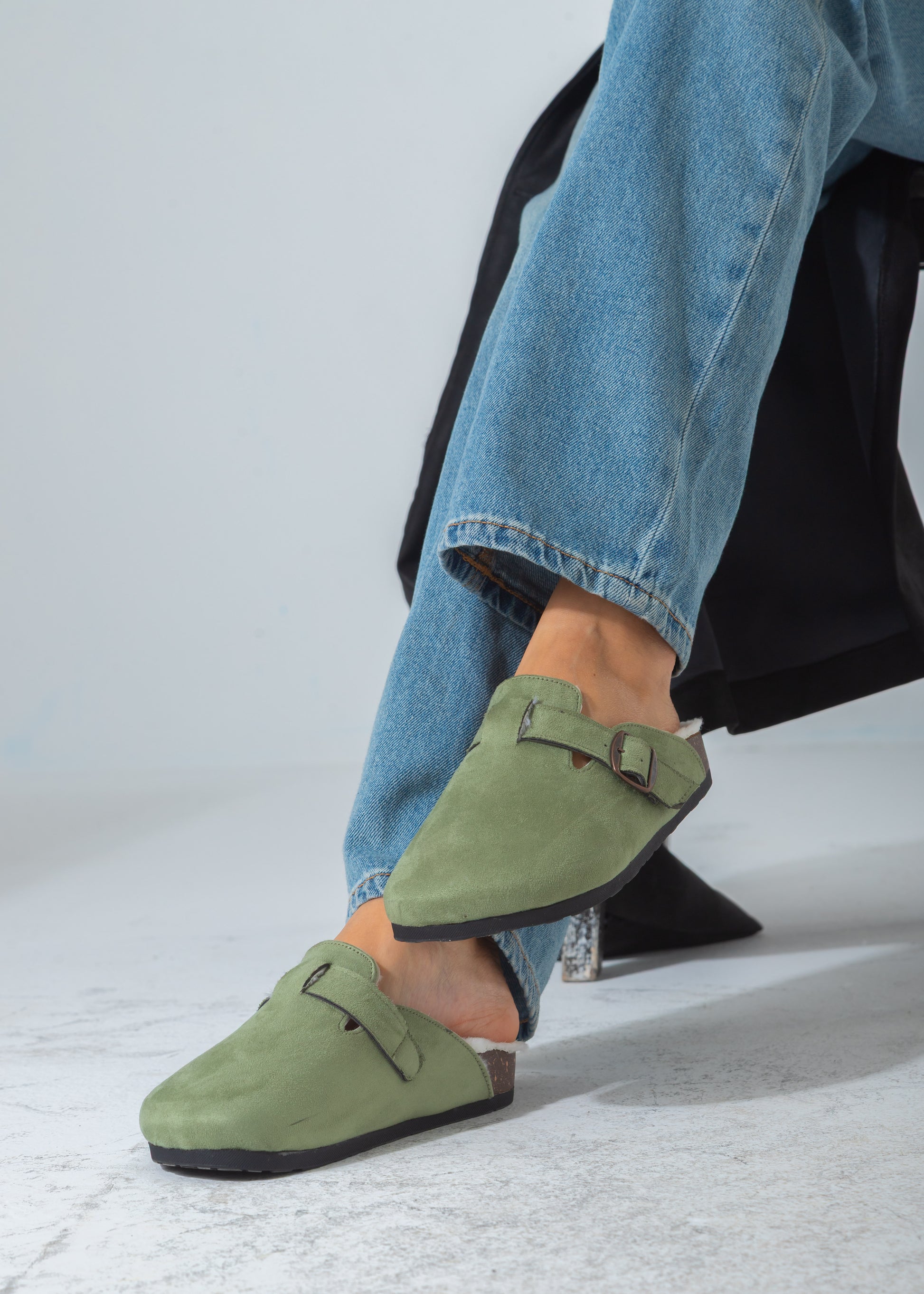 Suede Buckle Cork Footbed Clog-green